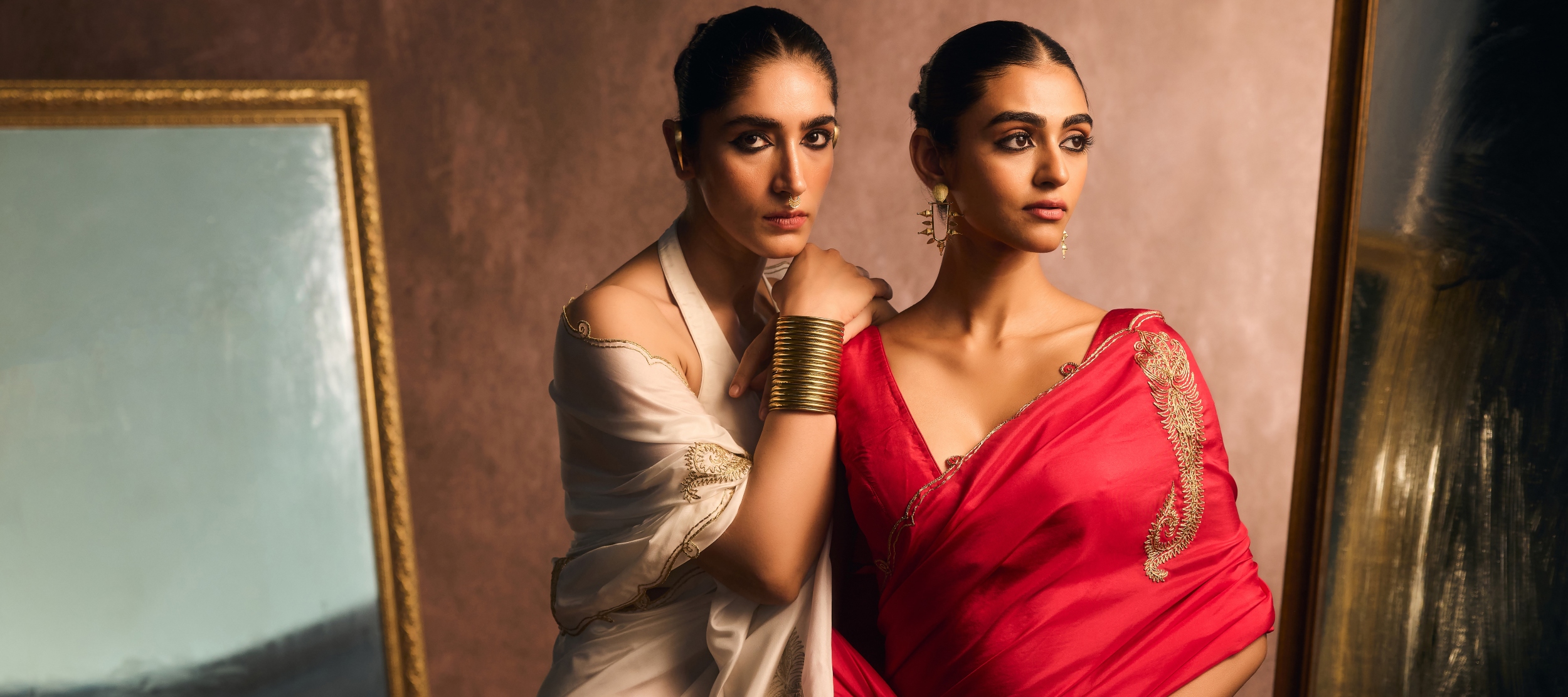 Inspiration – Sisters Sneha and Geetanshu Shekhawat grew up listening to stories of palaces, gems, and vintage attire and were always drawn to traditional workmanship grounded in their Rajputana descent. With self-taught skills in fashion, they founded Kapardara with the goal of creating powerful and unique designs through time-honoured techniques like miniature art and ada kaam. We turn to the vastness of the universe for inspiration – be it faraway galaxies or lush jungles. Closely watching the world drives us to create striking drapes in organza and silk.