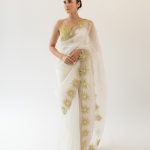 Celeste saree – a pure silk organza saree in the shade of ivory features a beautiful pattern of intricate floral scalloped hand-embroidery – handcrafted with golden zari and aari with a gorgeous splash of pearls, it is undoubtedly a head turner. Paired with our handcrafted celeste blouse it totally accents the glam quotient.