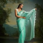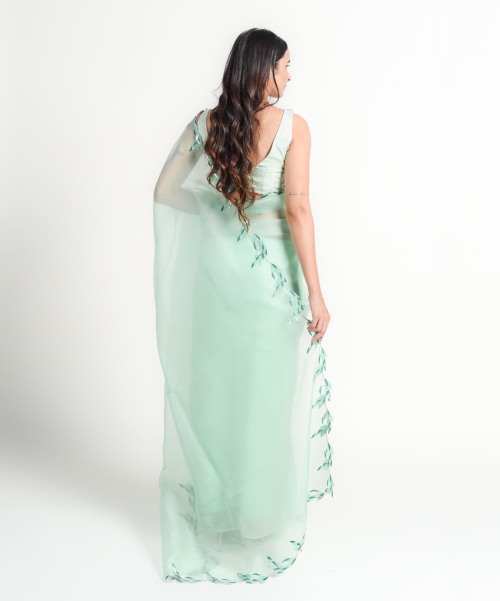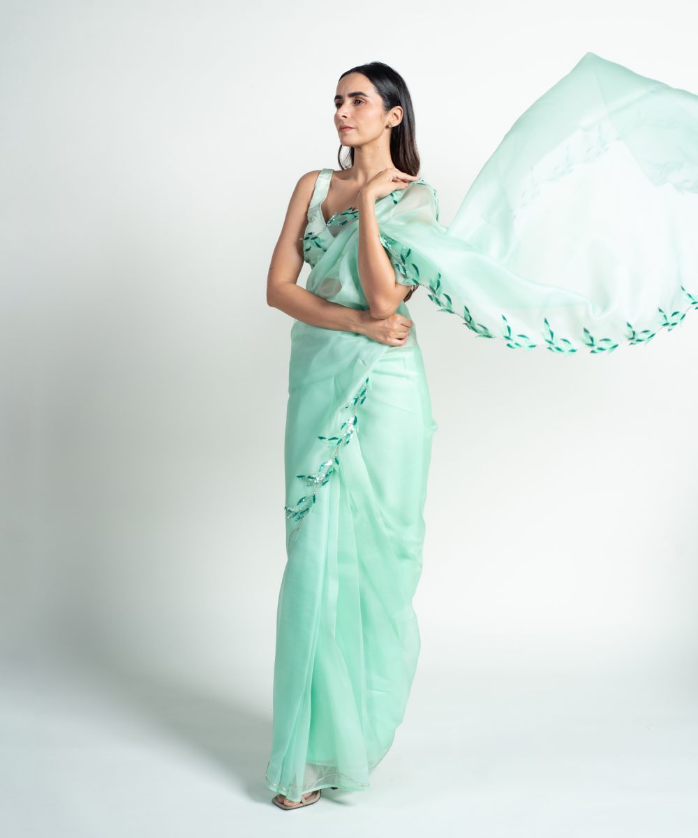 Lumina Leaf Saree – a symphony of pure silk organza in a tranquil turquoise green. Crafted with delicate sequences and micro tubelights this masterpiece is a radiant ode to nature’s grace. The skilled hands of master karigars have sculpted its edges into a ballet of scalloped elegance, mirroring the intricate dance of leaves. A sublime tribute to the beauty that surrounds us, the Lumina Leaf Saree is a wearable masterpiece, capturing the essence of leaves in every ethereal fold.