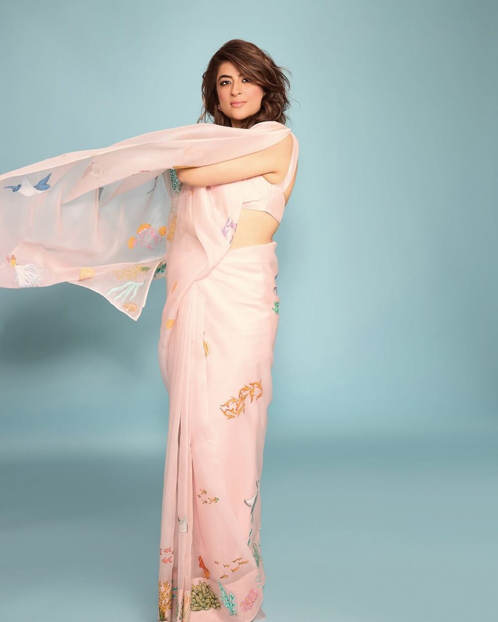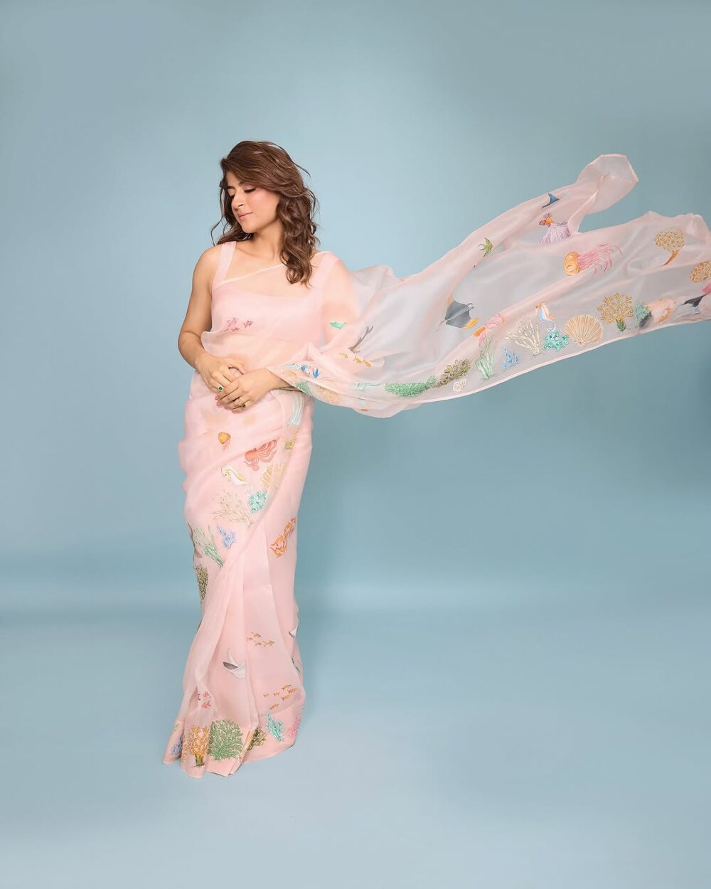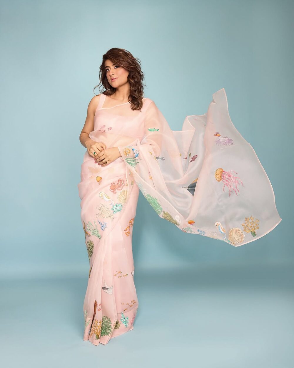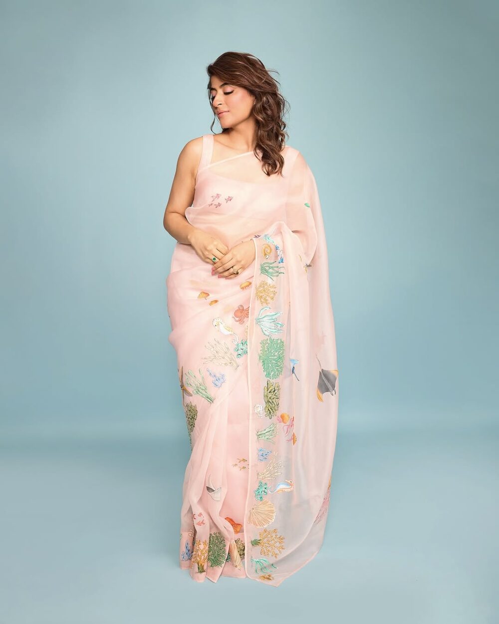 A pure silk organza saree in the shade of teal with hand-painted motifs depicting the beautiful wonders of the ocean’s treasures. Highlighted with micro tube beads, pearls, aari and zardozi work it is surely a head turner.