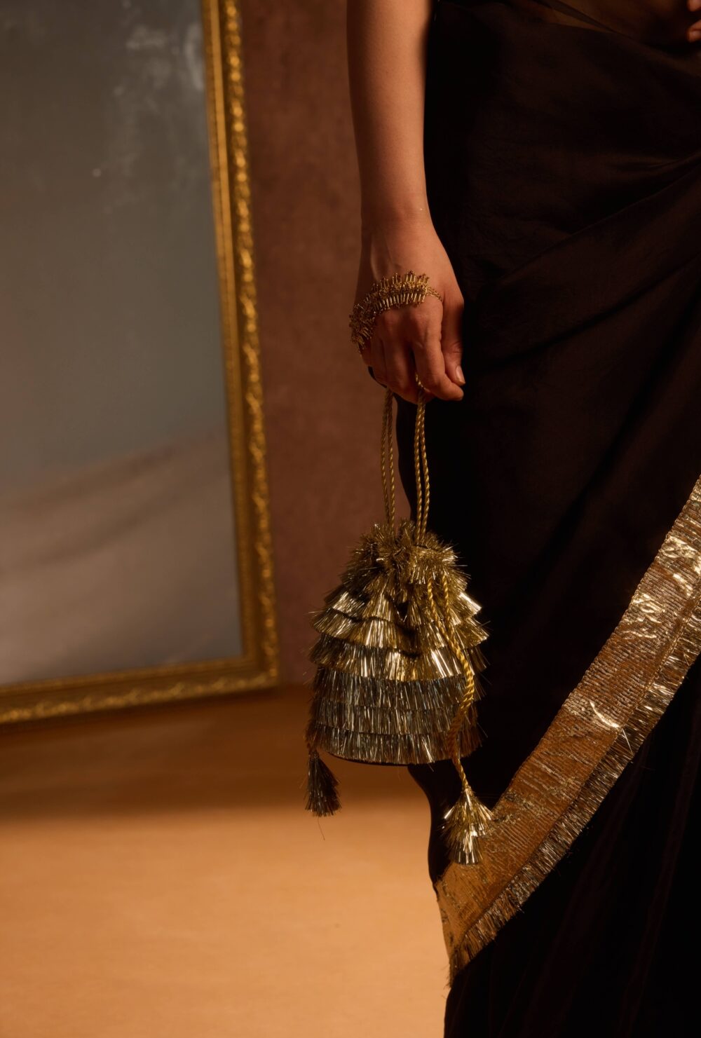 Bold yet refined, the Onyx Potli is a radiant expression of timeless elegance. Drenched in a rich golden hue, it is crafted with intricate golden turi work that adds texture, shimmer, and depth to its luxurious presence. Entirely handmade by skilled artisans, every detail speaks of precision and passion. Whether paired with festive attire or contemporary looks, the Onyx Potli brings a statement of grace and grandeur to every occasion.
