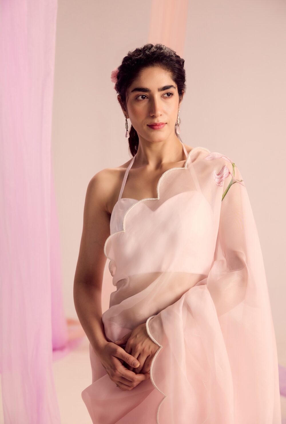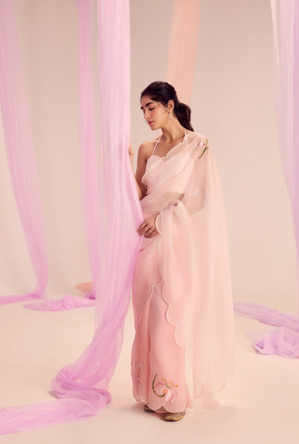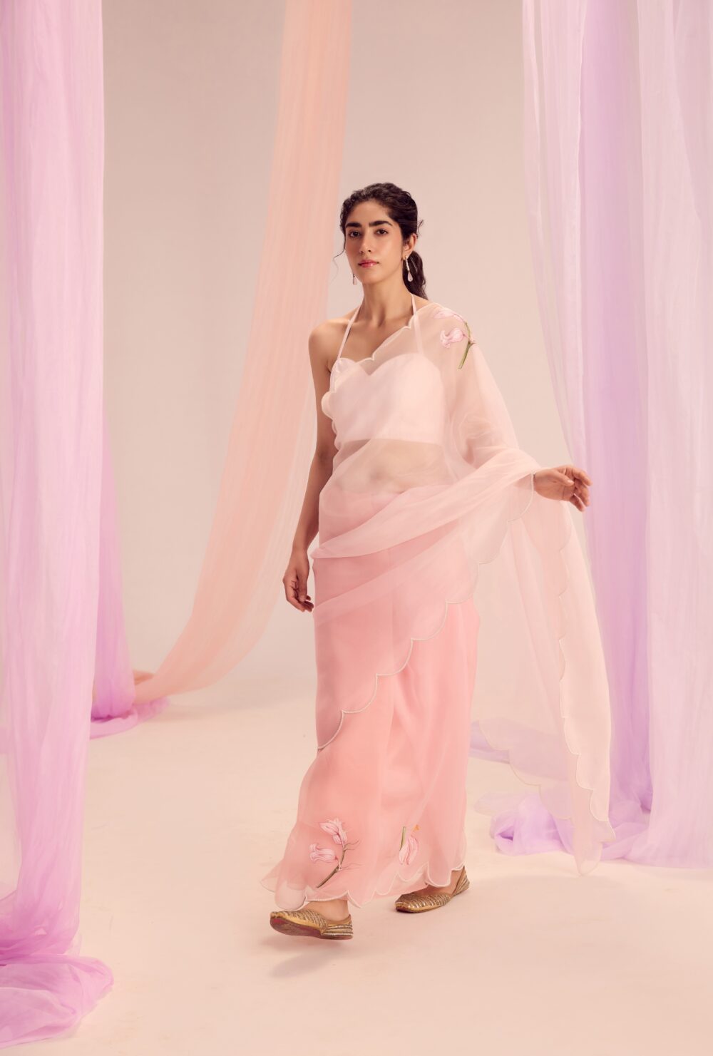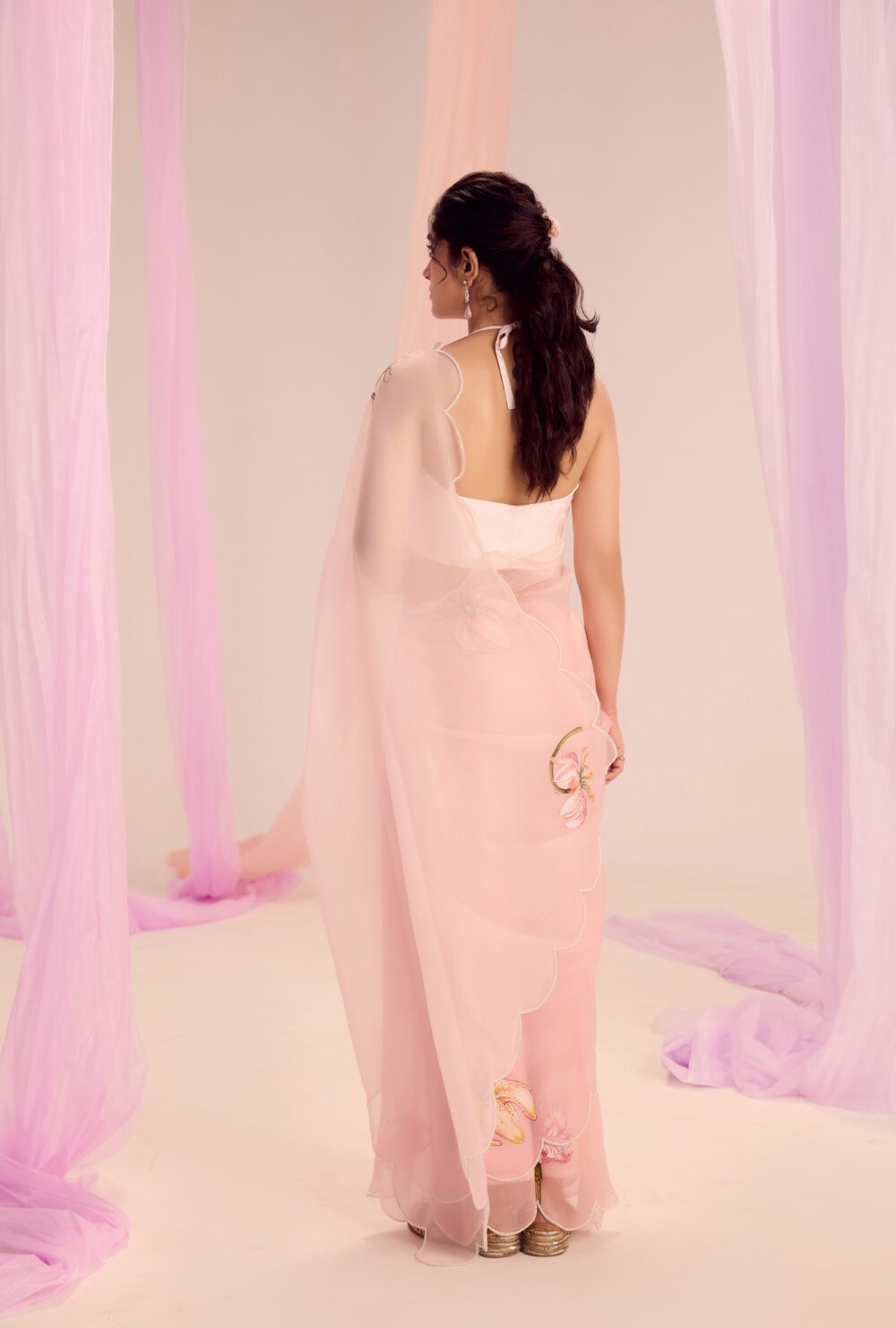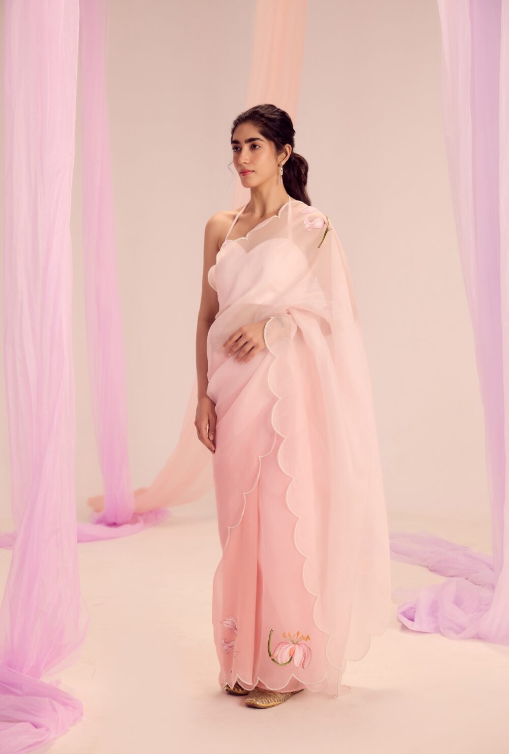 Crafted through the seamless joinery of luxurious silk and sheer silk organza, the saree flows in soft pink hues, offering a gentle, serene base. It’s beautifully framed with delicate green piping that highlights the natural elements within the artwork.
